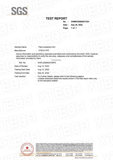 SGS, dünya genelinde tanınan bir test, denetim ve belgelendirme kuruluşudur. XTECH'in boya koruma filmleri (PPF), SGS tarafından test edilerek belirli kalite ve güvenlik standartlarına uygunluğu onaylanmıştır. Bu sertifika, XTECH PPF ürünlerinin dayanıklılık, performans ve güvenilirlik açısından uluslararası standartları karşıladığını gösterir. TPD Garaj olarak, Türkiye'deki yetkili XTECH distribütörü olarak, SGS sertifikalı bu yüksek kaliteli ürünleri müşterilerimize sunmaktan gurur duyuyoruz.